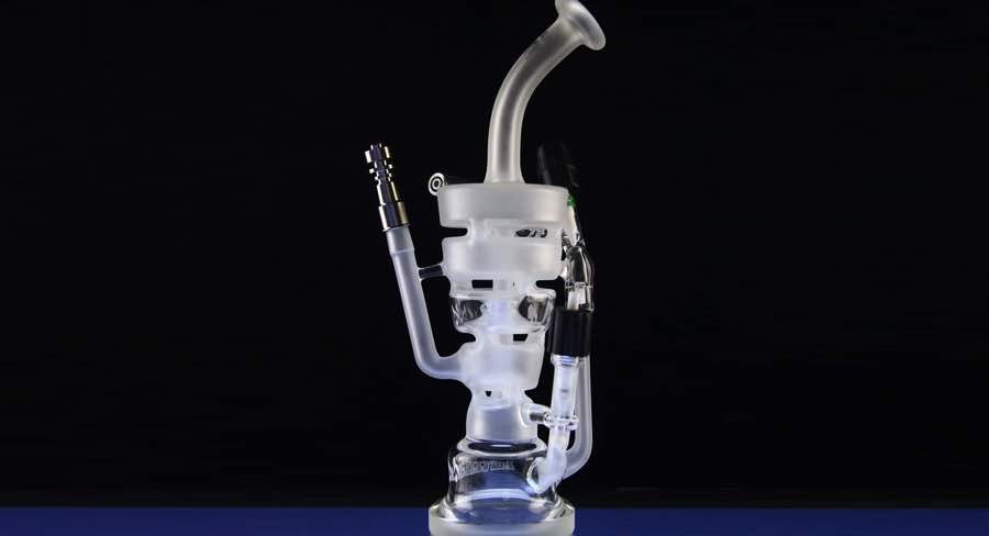The Sundae Stackcontains has five separate chambers and uses the body of the pipe as one large percolator. The whole rig (excluding the base) is sandblasted with Hitman logos etched across the base and middle section. It also contains a sealed-off chamber of butane, plus its own torch within the glass rig.