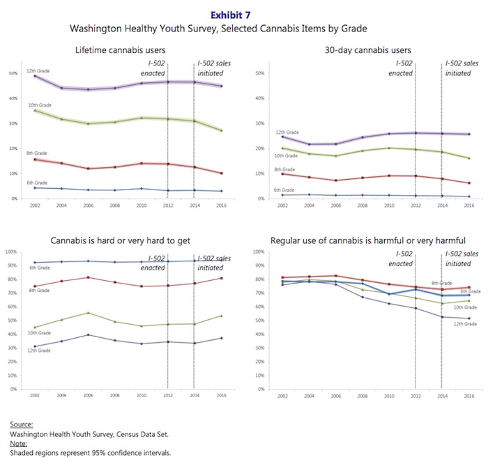The report generated by the Washington State Institute for Public Policy utilised data gathered by the Washington Healthy Youth Survey (HYS). Administered on a biannual basis on even numbered years, the HYS found youthful marijuana consumption “in grades 6, 8, 10, and 12,” has been “stable or fallen slightly” since I-502 was passed by Washington’s voters.