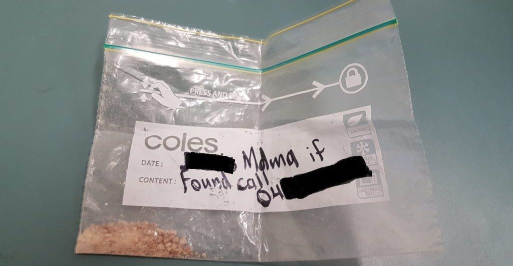 The cops subsequently located a clip seal bag on him, labelled “XXXX’s Mdma if found call 04XXXXXXXX”.